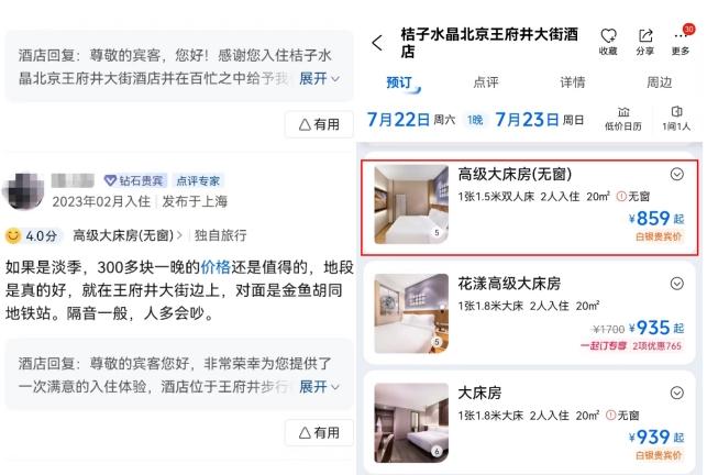 中新经纬近日通过携程平台查询到,北京王府井大街附近的桔子水晶酒店7月22日(周六)的房价在830元到1650元不等,部分房型售罄。在旅客评价中,一位今年2月入住过高级大床房(无窗)的消费者称其当时房价为每晚300多元,而该房型7月22日价格为859元,按此计算,该房价格在约半年间相差两倍多。