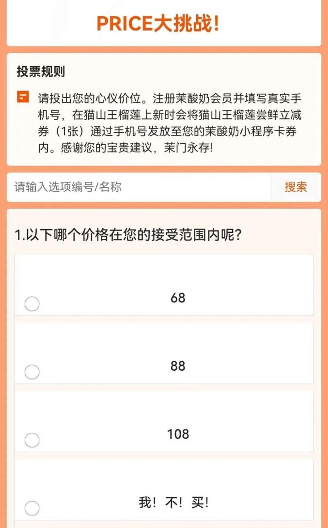 近日,茉酸奶上线了一份问卷调查,征集消费者对即将上新的猫山王榴莲奶昔的心理价位,三个价格选项分别为68元、88元、108元。并提到,“由于主打真材实料,无法避免昂贵的价格。”