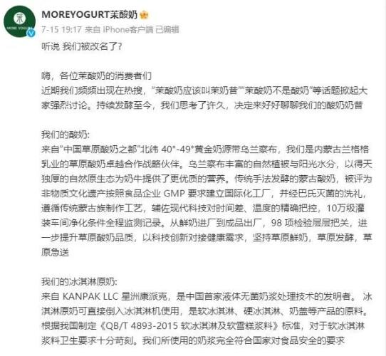 茉酸奶7月15日也公开回应称,酸奶来自乌兰察布,公司是内蒙古兰格格乳业的草原酸奶合作战略伙伴。冰淇淋原奶来自KANPAK LLC星洲康派克,是软冰淇淋、硬冰淇淋、奶盖等产品的原料。所使用的奶浆完全符合国家对食品安全的要求。