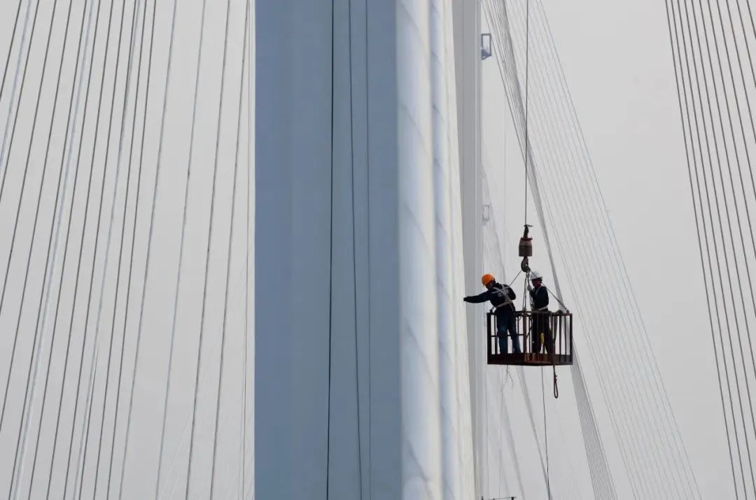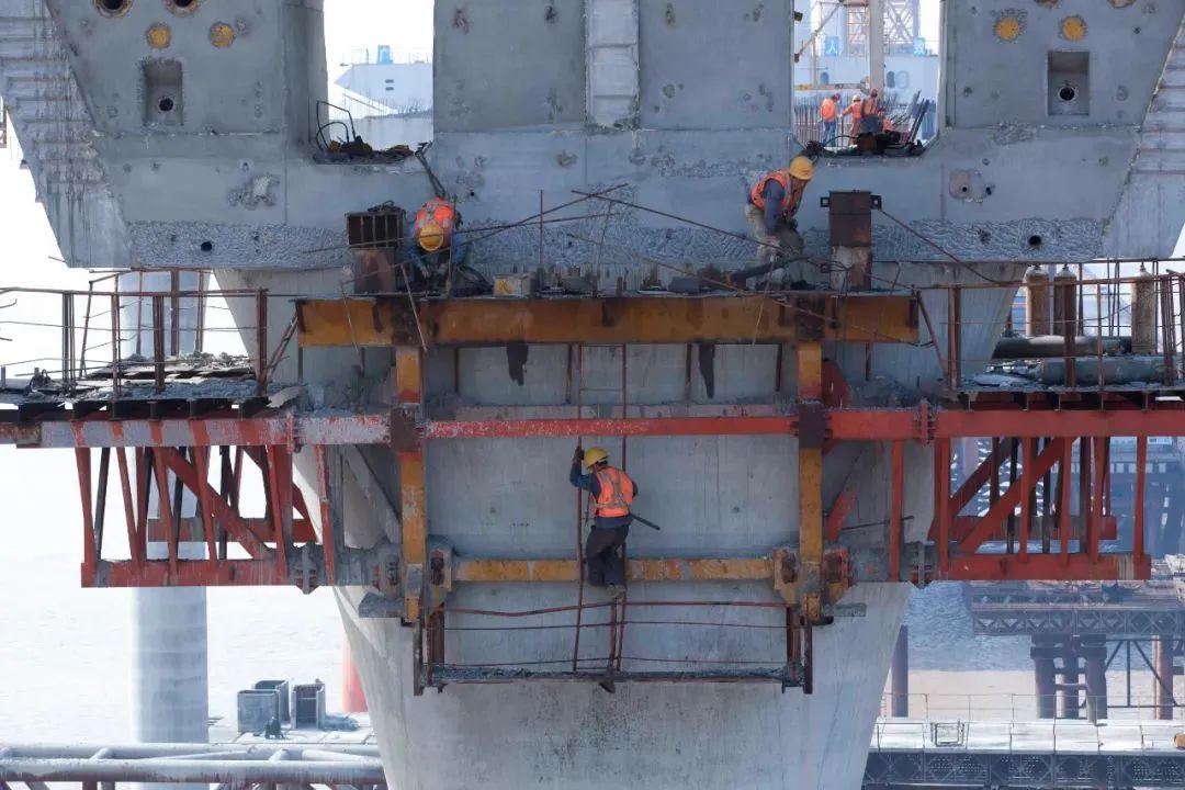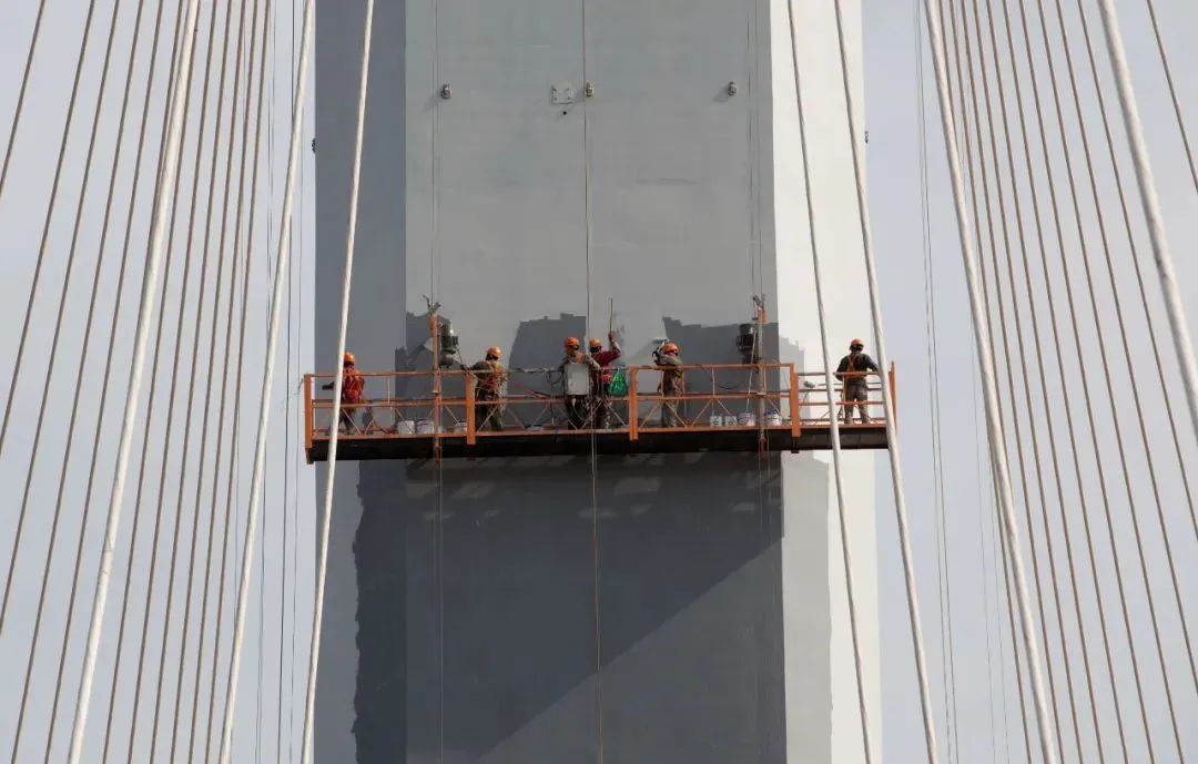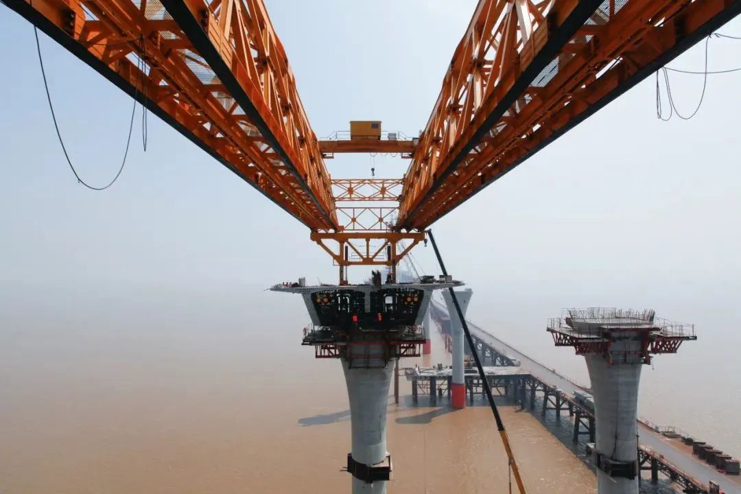 站在钱塘江边极目远眺,嘉绍大桥犹如一条“巨龙”飞跨钱江两岸;六座主塔犹如擎天柱巍然耸立,直冲云霄;一排排桥墩犹如一双双巨掌,将块块箱梁稳稳托起;桥身如同翻江巨龙蜿蜒伸向江心……