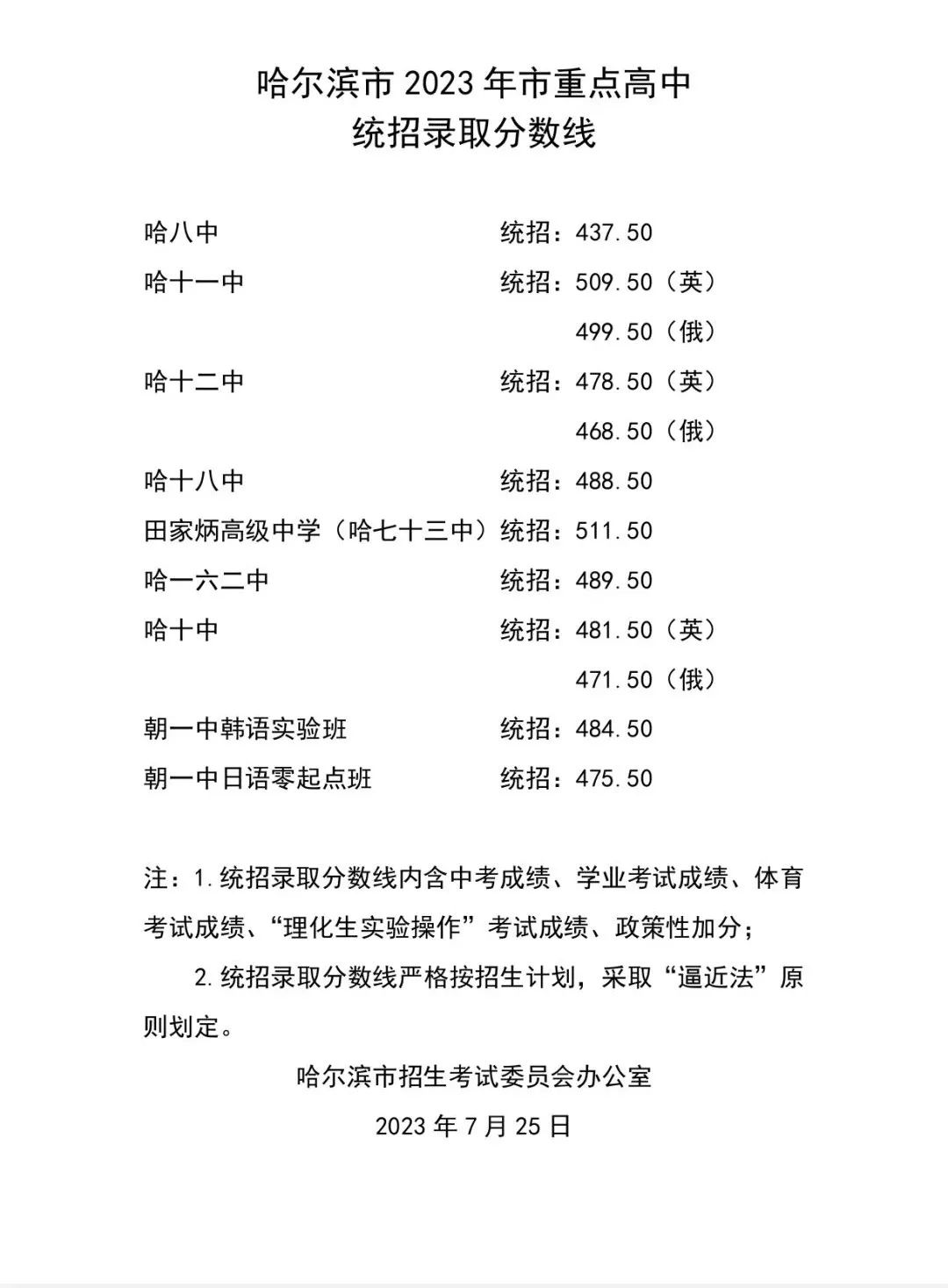 原标题:《哈尔滨市2023年市重点高中统招录取分数线公布》