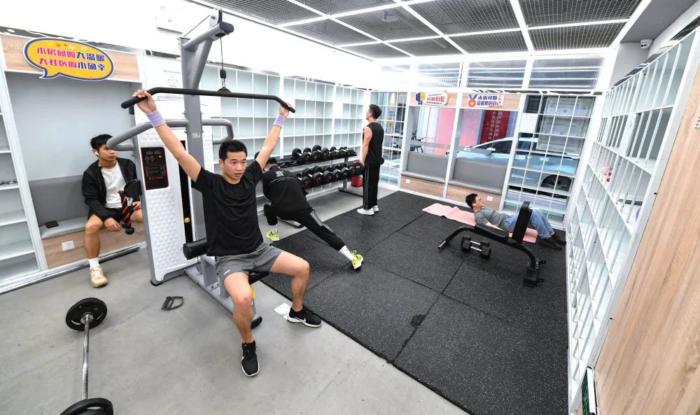 4月2日,深圳市龙华区元芬村,青年公寓住户在社区增设的健身房锻炼(毛思倩/摄)社区体验