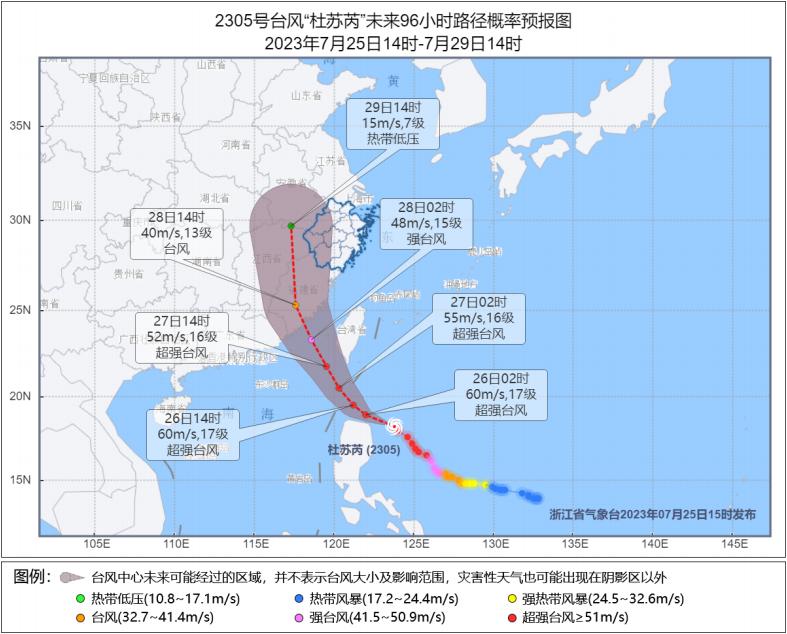 以目前路径预报,受台风“杜苏芮”外围环流影响,明起浙江会有明显风雨过程,时段主要在26-28日。预计7月26日-28日,东海中南部海域9-11级阵风,东海北部海域和浙江沿海海面8-9级阵风。26日沿海地区部分中到大雨,局部暴雨;27-28日沿海地区中到大雨部分暴雨,其中东南沿海地区局部大暴雨。