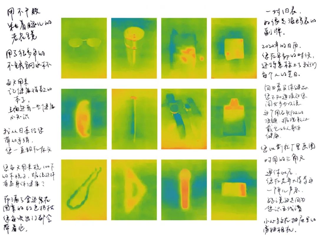 Voicer 在你近期的作品“Grandma:姥姥”中,你换了和以往不一样的拍摄方式,使用热像仪记录姥姥的遗物,为什么会选择这种处理方式?卢禹凡 我一开始想用热像仪去看看这个世界。我就发现,在热像仪成像下,如果有人刚刚坐在某个地方,然后ta离开了以后,这里仍然也留着ta的痕迹。