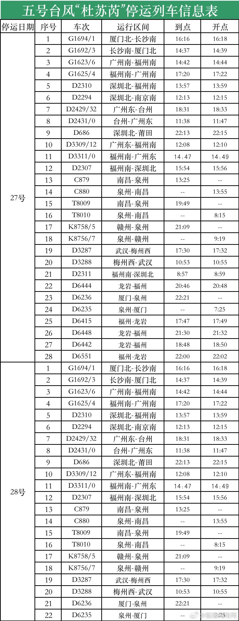 50趟经停泉州的列车停运!目前,台风“杜苏芮”已进入24小时警戒线!刚刚,闽南网记者从中国铁路南昌局集团有限公司(以下简称“南铁”)漳州车务段获悉,受今年第5号强台风“杜苏芮”的影响,27日和28日两天,多趟经停泉州火车站的列车停运,提醒旅客注意关注出行信息。