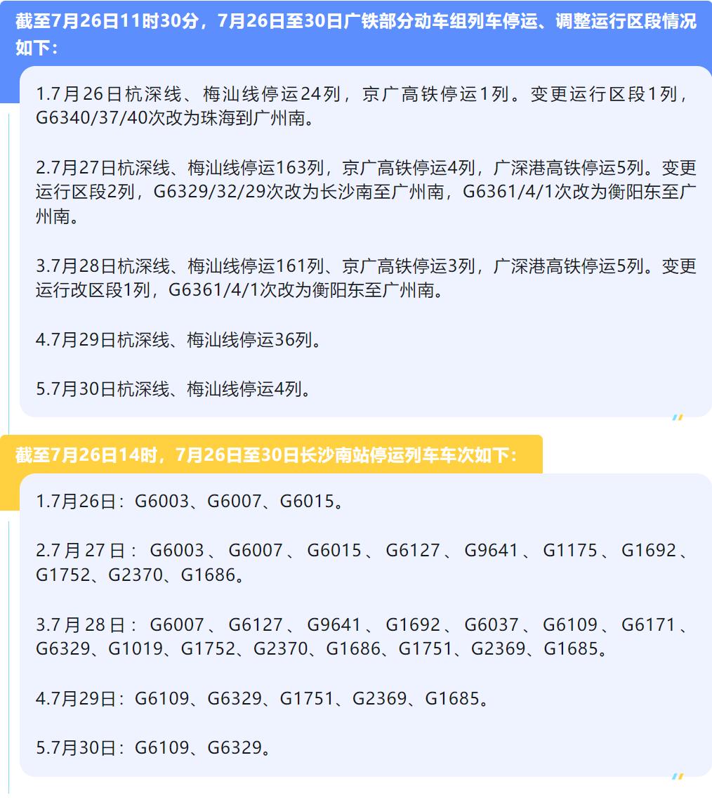 截至7月26日11时30分,7月26日至30日广铁部分动车组列车停运、调整运行区段情况如下: