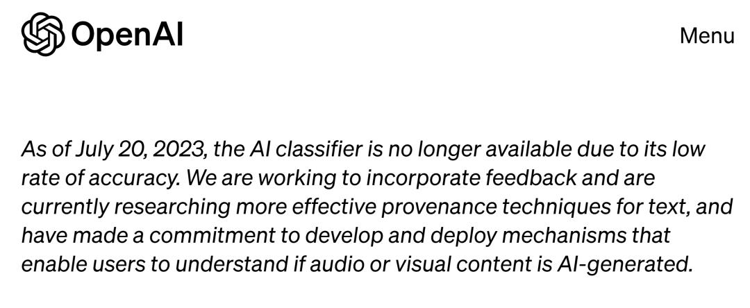 OpenAI 没有发布宣布该消息的新公告,而是在曾经发布 AI 分类器的网页上加入了一段它不可再用的文字。