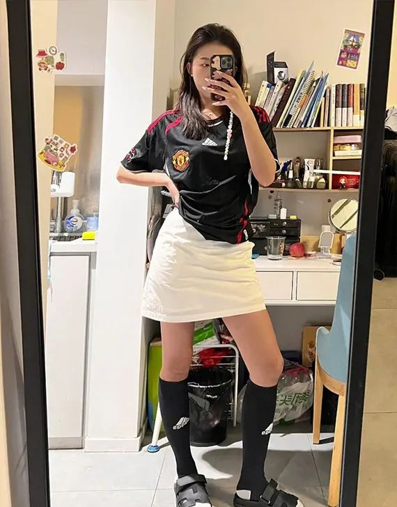 cr博主:吕颖lvy想要穿将球衣穿出甜酷感,共和君推荐用运动百褶裙去搭配,足球球衣和网球百褶裙混搭,不同风格的混搭真的是绝佳搭配。