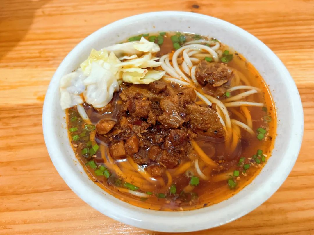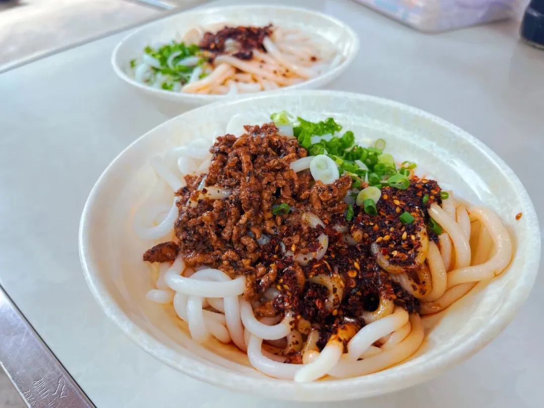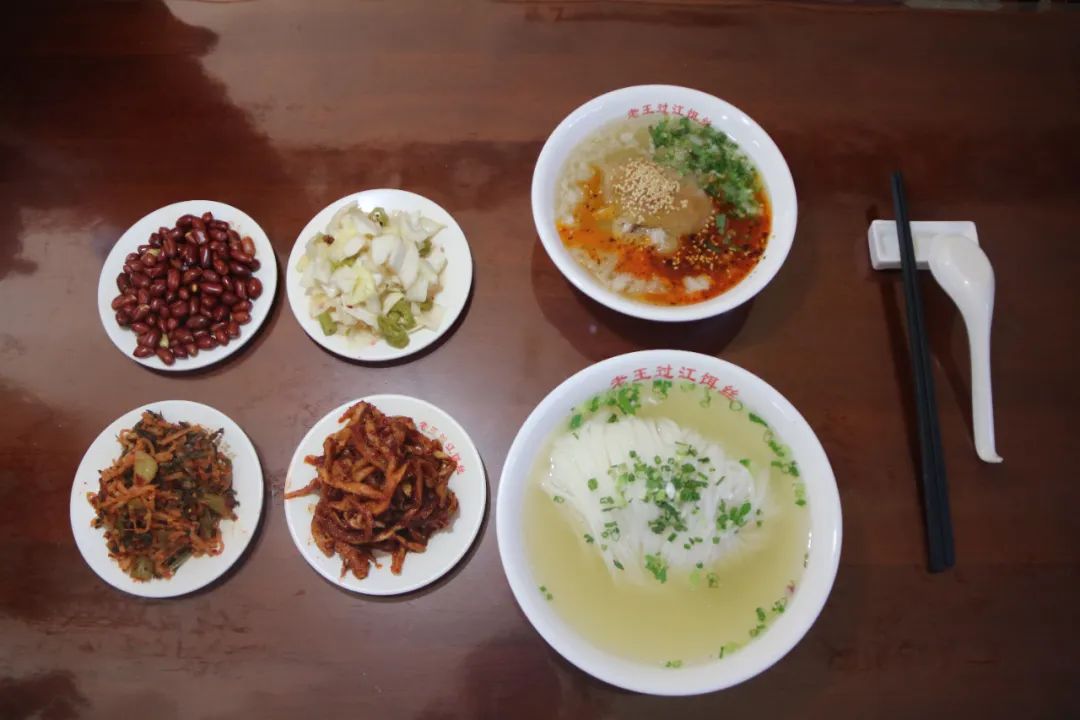 “过江饵丝,一碗饵丝一碗肉,肉碗里放好了各类调料,挑起饵丝打蘸水,青龙过江。”除了(火巴)肉饵丝,“老王过江饵丝”的经营者们还在(火巴)肉饵丝的基础上创新出了过江饵丝,也是值得品尝的一道特色小吃。