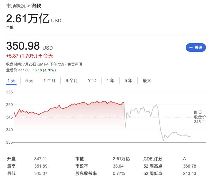 ▲微软股价盘后一度跳水4%(图源:谷歌财经)