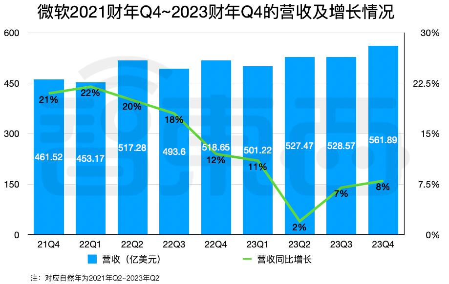 在微软2023财年Q4(对应自然年2023年Q2),微软营收达561.89亿美元,同比增长8%,可以看到经历了新冠肺炎疫情后的增长放缓后,业绩开始逐步恢复增长,但连续三季度增长仍低于10%。