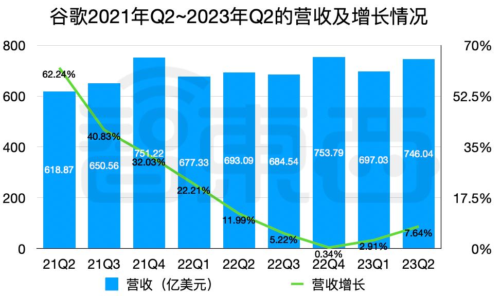 再看看谷歌这边,第二季度总营收达到746.04亿美元,高于华尔街分析师预期预测的728亿美元,同比增长7.64%。这一增速与前两年新冠疫情期间的两位数增长有较大差距,但已逆转了前两季度的下跌,出现回暖趋势。