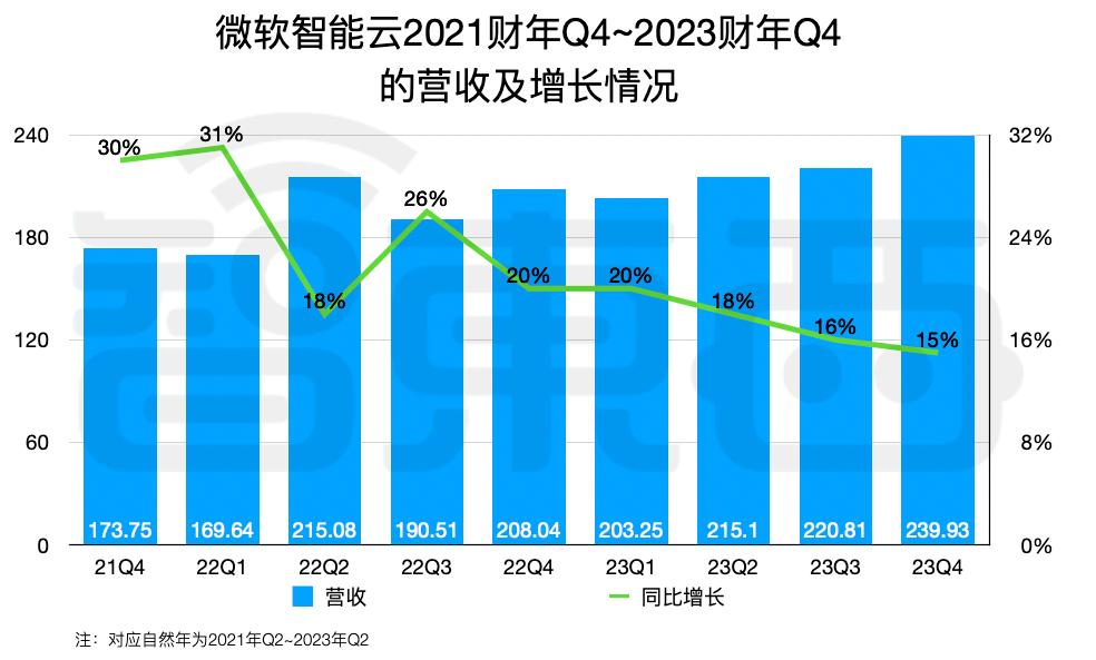 在微软2023财年Q4(对应自然年2023年Q2),微软智能云营收为239.93亿美元,略高于分析师预测的238亿美元,同比增长15%。