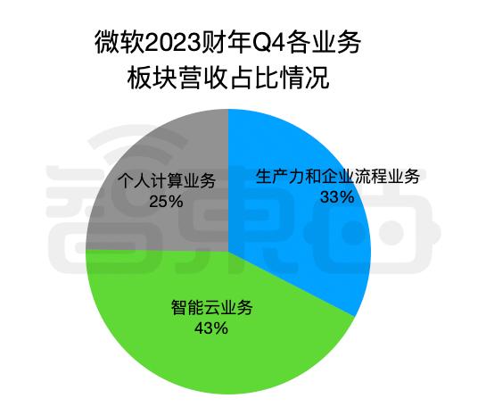 ▲微软智能云2021财年Q4~2023财年Q4的营收及增长情况微软主要有三大业务板块,个人计算业务、生产力和企业流程业务、智能云业务。从整体业务板块来看,微软智能云业务占总体营收达到43%,已成为微软的最大营收板块。