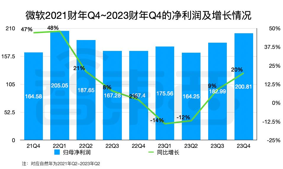 在微软的2023财年Q4(对应自然年2023年Q2),微软净利润达到200.81亿美元,这是近七个季度以来首次突破200亿美元;同比增长20%,不再出现2022年类似的负增长,且增速正在加快。