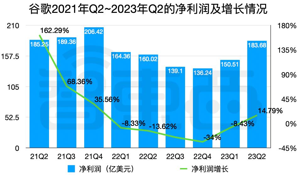 ▲微软2021财年Q4~2023财年Q4的净利润及增长情况谷歌这边,谷歌母公司Alphabet在2023年第二季度净利润为183.68亿美元,同比增长14.79%,更是一扫前四个季度的颓势。