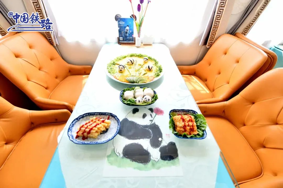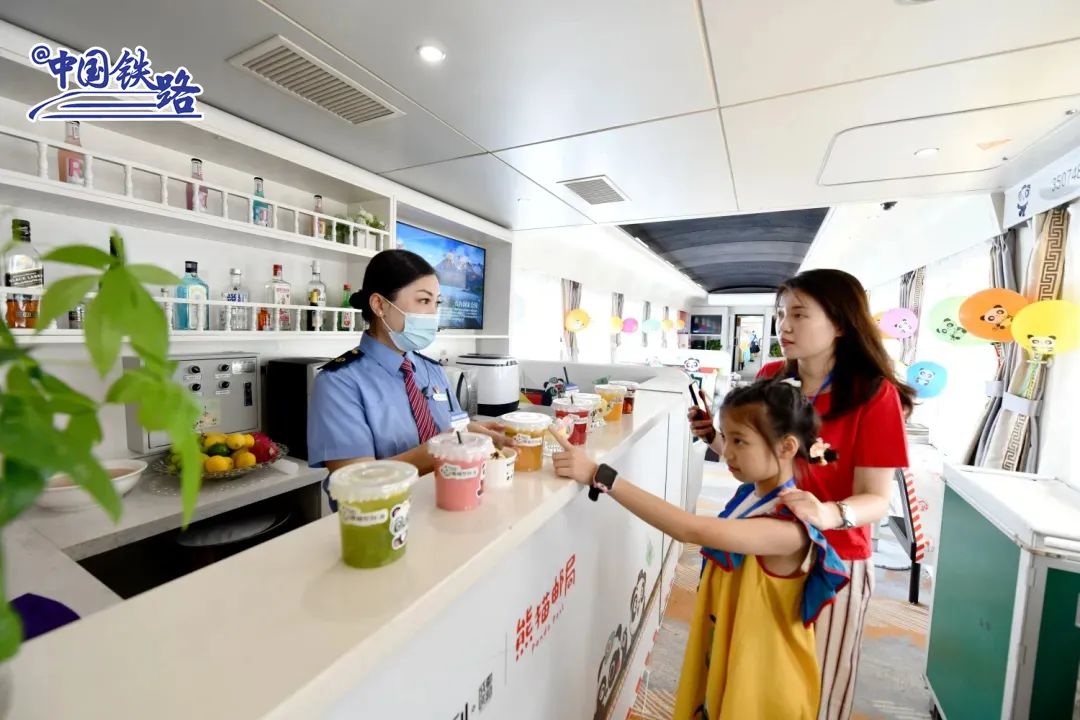 此外,工作人员还在“熊猫专列”上精心布置了“熊猫乐园”,准备了熊猫套餐、熊猫冰粉、熊猫汤圆等可口餐食,以及七彩冰激凌、手打柠檬茶、鲜榨果汁等甜品,进一步丰富小朋友和“大朋友”们的火车旅行生活。