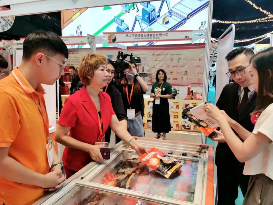 何氏水产展位前,工作人员介绍产品。“工业上楼”进度条刷新!南海大沥泌冲“大滘水闸”地块摘牌