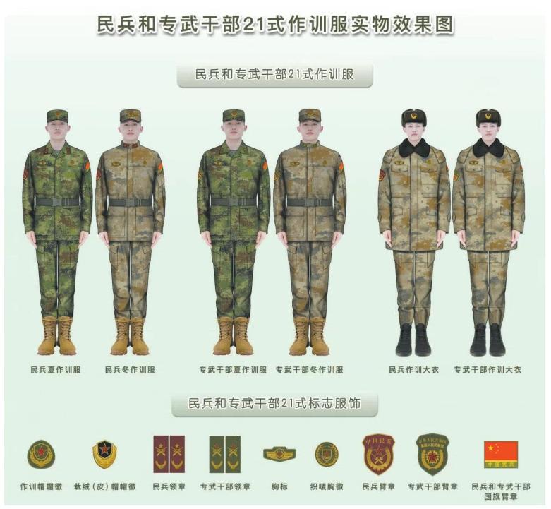 经国务院、中央军委批准,2023年8月1日起,全国基干民兵、专职人民武装干部将陆续配发启用21式作训服。民兵和专武干部目前使用的各类军服和标志服饰,将于2023年12月31日前停止使用。>>详细阅读:人民网