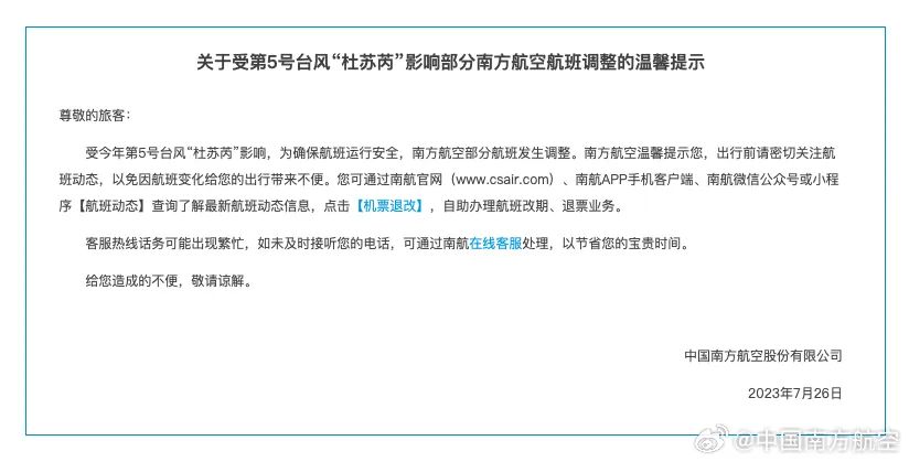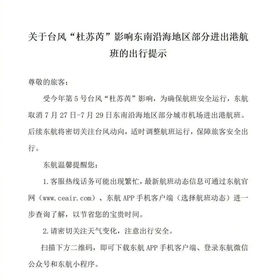 计划乘坐飞机的旅客注意了!受今年第5号台风“杜苏芮”影响,为确保运行安全,东航、南航、吉祥航空、春秋航空等已取消部分航班。