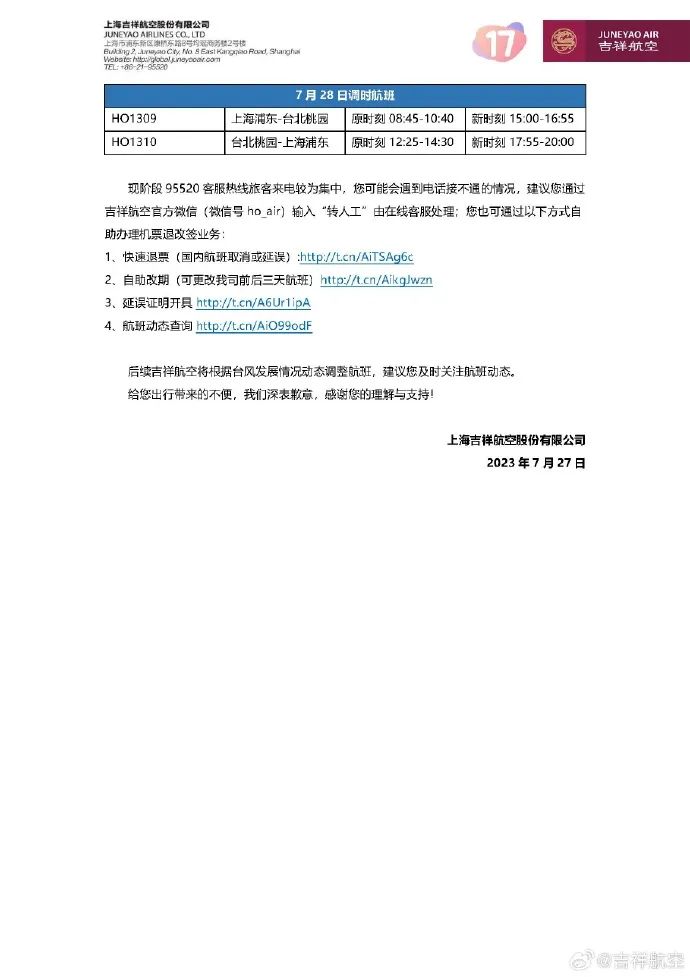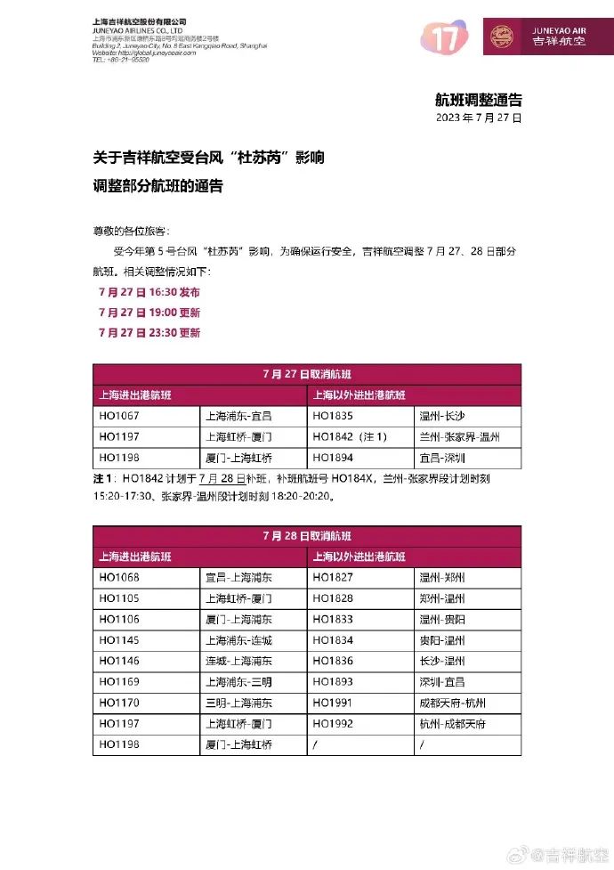 受今年第5号台风“杜苏芮”影响,为确保运行安全,吉祥航空调整7月27、28日部分航班。截止目前具体取消情况如图。