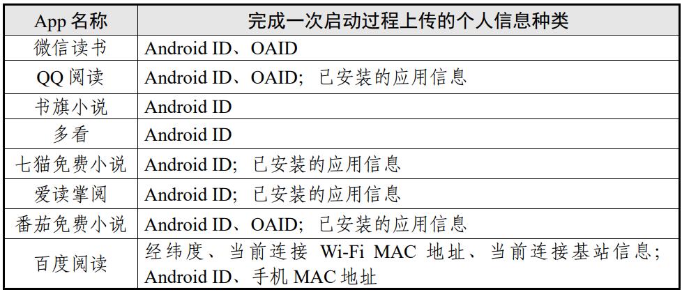 (1)在启动App场景中,个人信息上传种类最多的为QQ阅读、七猫免费小说、爱读掌阅、番茄免费小说、百度阅读(均为2类)。具体情况如表6。