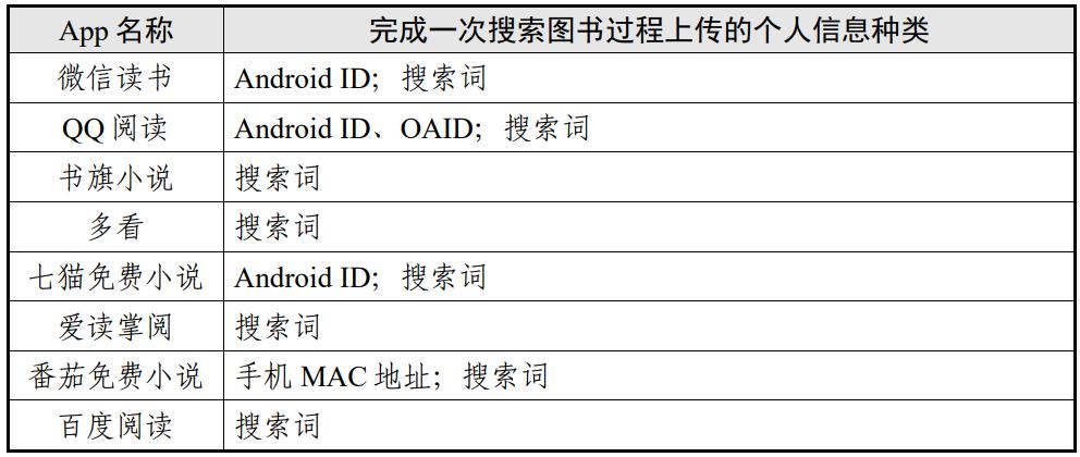 (2)在搜索图书场景中,个人信息上传种类最多的为微信读书、QQ阅读、七猫免费小说、番茄免费小说(均为2类)。具体情况如表7。表7 搜索图书场景个人信息上传情况