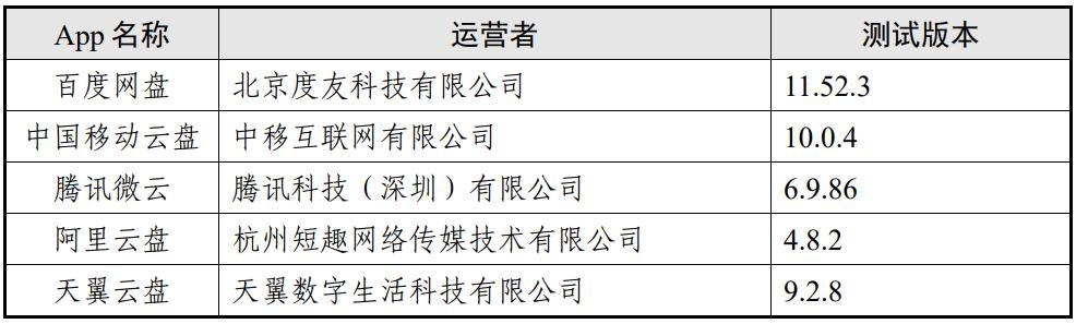 本次测试选取了19家应用商店⁽⊃1;⁾累计下载量达到1亿次的“云盘类”App,共计5款,其基本情况如表1。