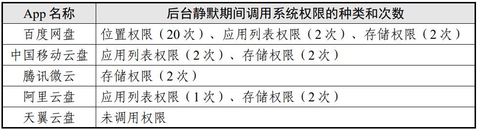 (4)在后台静默场景中,调用系统权限种类和次数最多的为百度网盘(3类,24次)。具体情况如表5。表5 后台静默场景调用系统权限情况