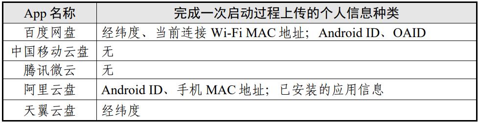 (1)在启动App场景中,个人信息上传种类最多的为百度网盘和阿里云盘(均为2类)。具体情况如表6。