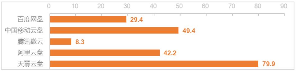 图1 完成一次云盘文件传输活动的平均上传数据流量(单位:KB)(2)5款App后台静默12小时,上传数据流量平均⁽⁴⁾最多的为天翼云盘,约为80KB;平均最少的为腾讯微云,约为8KB。具体情况如图2。