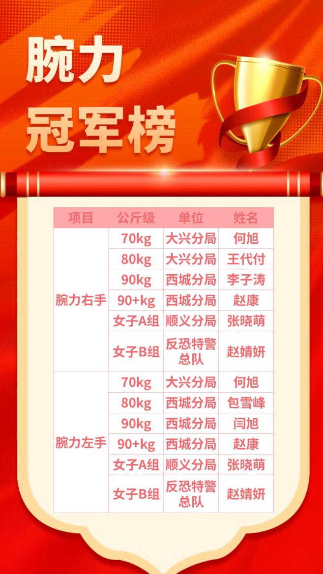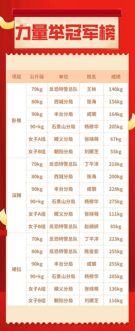 分为卧推、深蹲、硬拉和腕力比赛4个项目