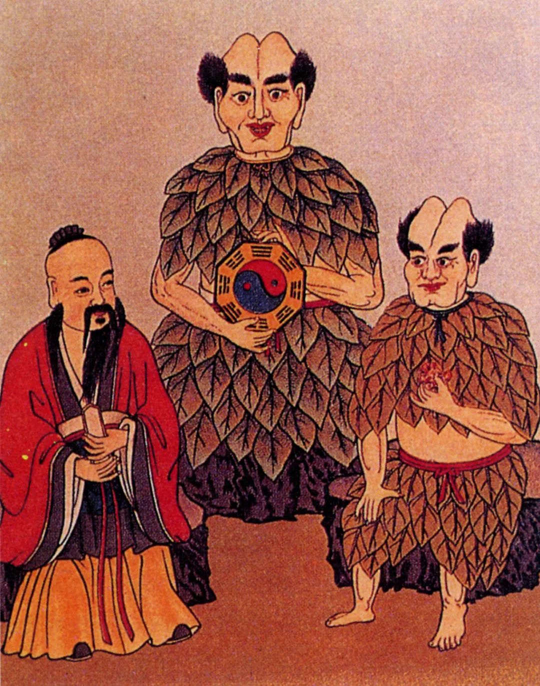 这幅画像模仿了《山海经》里面的神人形象,画像上是穿树叶时装的始祖。(图/视觉中国)那么如今,介于“古代科学”和“现代科学”之间,我们又应该如何重读《山海经》?对此,刘宗迪也提出了自己的看法。