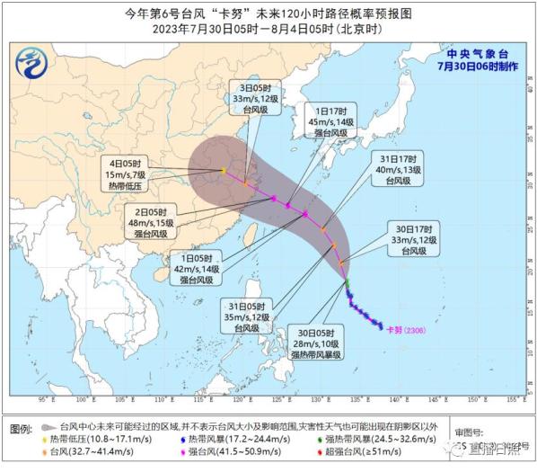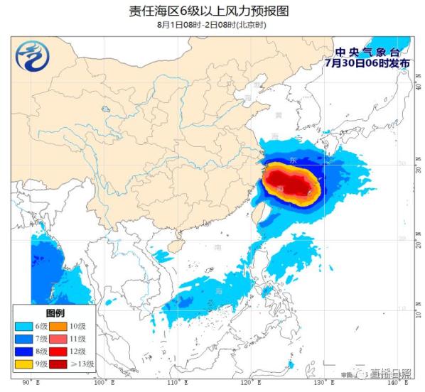 7月31日夜间至8月1日夜间,黄海南部海域、东海大部海域、台湾以东洋面将有6~7级、阵风8~9级大风,其中东海南部部分海域将有8~11级、阵风12~13级大风,台风“卡努”中心经过的附近海域风力可达12~15级、阵风16级。