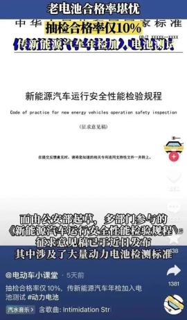 根据业内与媒体爆料信息,新能源汽车年检将会增加电池检测项目,不及格一律返厂维修或者更换,而且还称车龄6年以上的新能源车,电池检测合格率仅为10%。