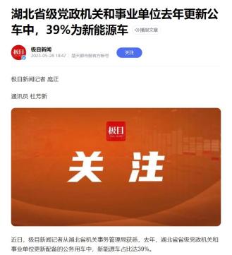 根据相关的媒体报道,国内部分地区的公务用车已经在开始采购新能源车了,比如根据极目新闻报道,湖北省级党政机关和事业单位去年更新公车中,39%为新能源车。
