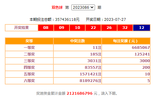 双色球2023086期:头奖11注668万 奖池21.21亿