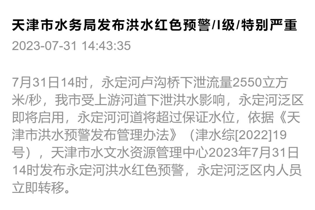 7月31日14时,永定河卢沟桥下泄流量2550立方米/秒,我市受上游河道下泄洪水影响,永定河泛区即将启用,永定河河道将超过保证水位,依据《天津市洪水预警发布管理办法》(津水综[2022]19号),天津市水文水资源管理中心2023年7月31日14时发布永定河洪水红色预警,永定河泛区内人员立即转移。天津市水文水资源管理中心
