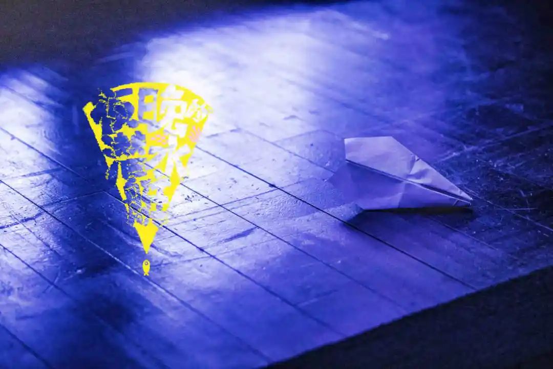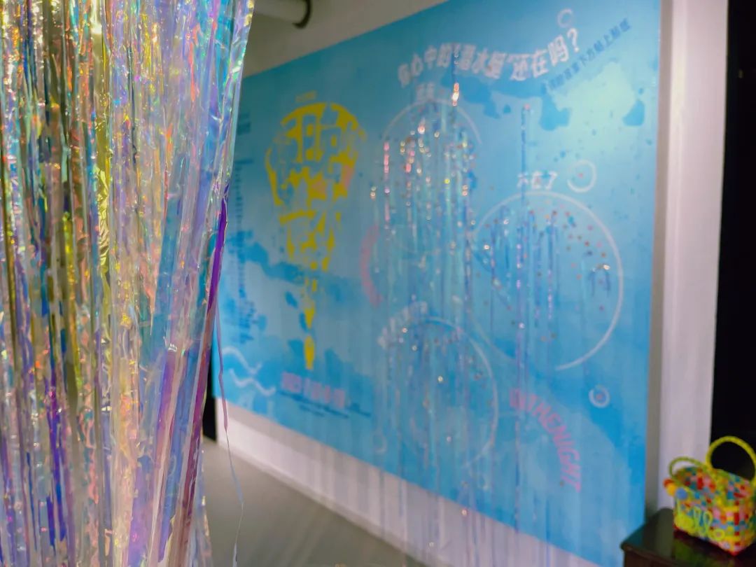 放置贴纸的篮子里垫了一些雨丝带仅作为装饰,但随着第一位观众把丝带也一起贴了上去之后,背景板增添了无数条色彩,就像《夜晚的潜水艇》舞台一样光影流动,我们也被这份瑰丽的想象力惊艳并打动。