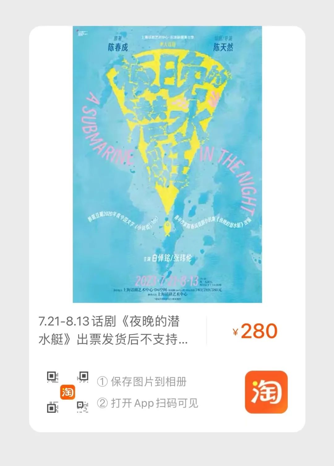 《夜晚的潜水艇》。很喜欢。我在拿手电照地图的时候,看着那个影子已经哭出来,前面刚好坐了人一个小孩,他前半段看得津津有味,后面缩在他爷爷怀里有些想走掉,我盯着他的背影和台上演员的背影我继续哭。我真的好喜欢。