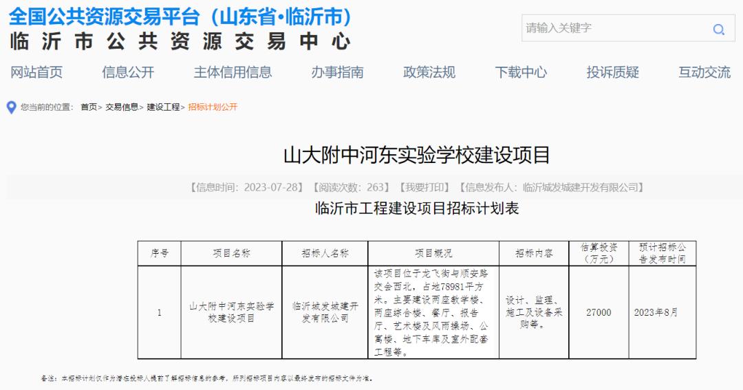 临沂市工程建设项目招标计划表项目名称:山大附中河东实验学校建设项目