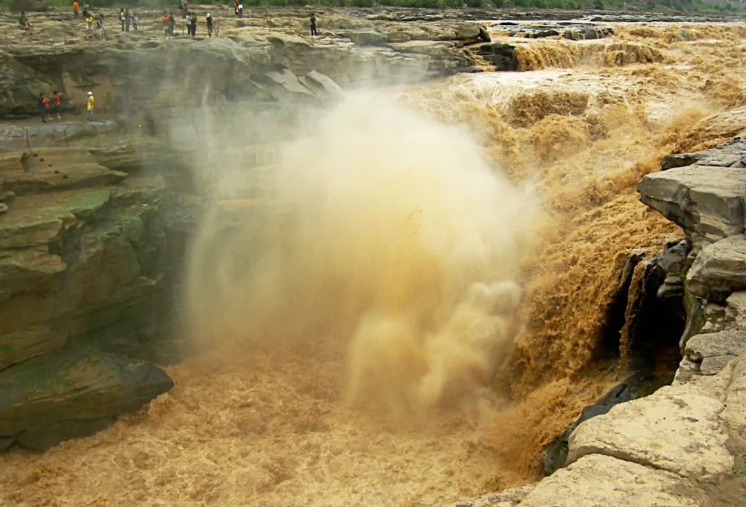壶口瀑布位于临汾市吉县西南约25公里。黄河奔流至此,两岸石壁峭立,河口收束狭如壶口,故名壶口瀑布。瀑布上游黄河水面宽300米,在不到500米长距离内,被压缩到20米至30米的宽度。流速1000立方米/秒的河水,从20多米高的陡崖上倾注而泻,形成“千里黄河一壶收”的气概。