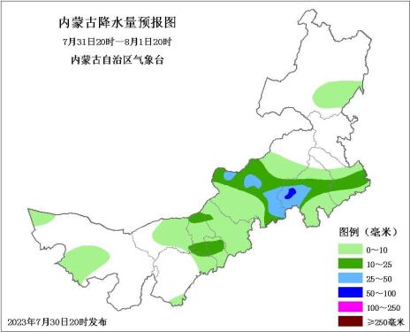 ↑↑↑ 7月31日20时至8月01日20时,预计包头市北部、呼和浩特市北部、锡林郭勒盟中部、赤峰市中部、通辽市南部部分地区有中雨,锡林郭勒盟中部、赤峰市西部有大雨,局地有暴雨。