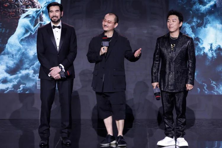 《封神第一部》路演现场,费翔(饰演殷寿)与黄渤(饰演姜子牙)同台。(图/由被访者提供)
