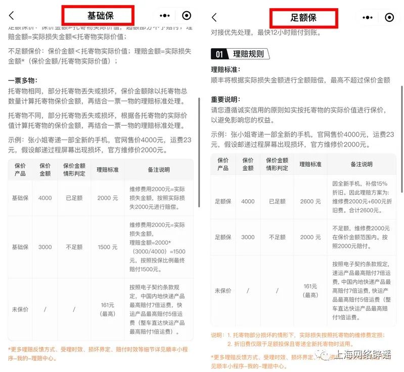 比如,顺丰就物品保价有“基础保”“定额保”和“足额保”3个选项。其中“基础保”和“足额保”接收手机等实物保价,“定额保”针对票据等无法衡量公允价值的物品保价。“基础保”的收费比“足额保”低一些,其标准是对保价金额500元以内的物品收1元/票,501元至1000元的收2元/票,1000元以上的按照申报价格的5‰收取。