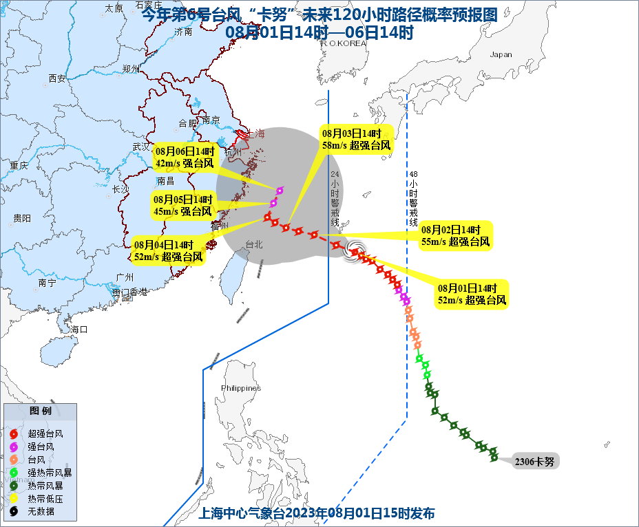 上海市气象服务中心介绍,“卡努”台风中心预计8月2日上午进入东海,向浙江中部至福建北部一带沿海靠近,4-6日可能在上述沿海海面回旋少动。今明天浙江北部沿海海面阵风将逐渐增强到8~9级,浙江中部和南部沿海海面阵风可达9~10级。