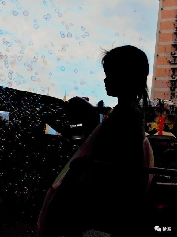 重庆-2023年6月24日,一个小姑娘正在单元楼门口玩泡泡机。 拾城者 黄鱼