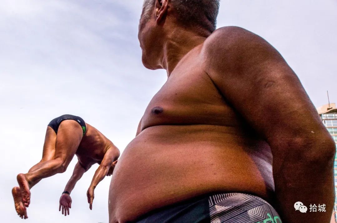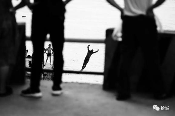 重庆-2023年7月9日,嘉陵江渡口码头,跳水爱好者们引得路人驻足观看。拾城者 冉文