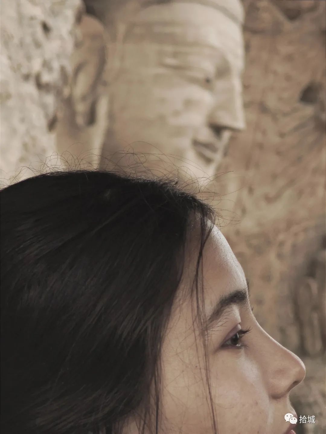 大同(山西)-2023年7月3日,云冈石窟,拍照的女孩与身后的大佛。拾城者 周伟文
