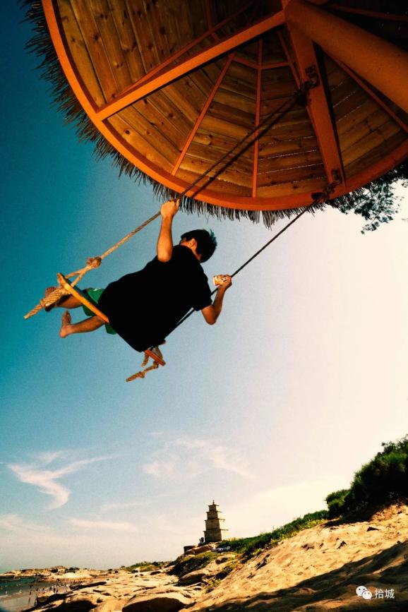 泉州-2023年7月18日,在海边荡秋千的小男孩。拾城者 林止月